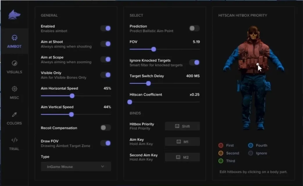 - Two types of aimbot input: Relative and absolute input for the aimbot.