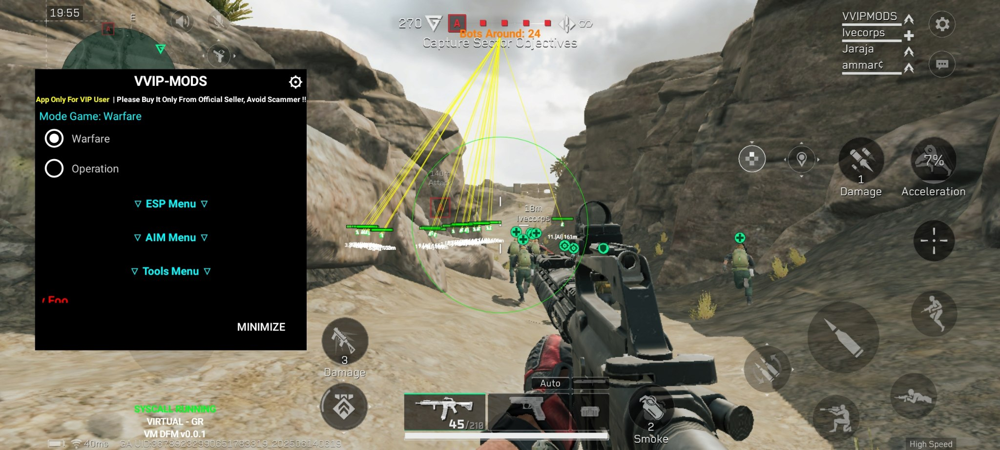 Vvip - один из топовых провайдеров приватных читов для различных игр. Данный чит на Delta Force Android, зарекомендовал себя с лучшей стороны, регулярные обновления, хороший функционал, много положительных отзывов и все это по доступной цене!