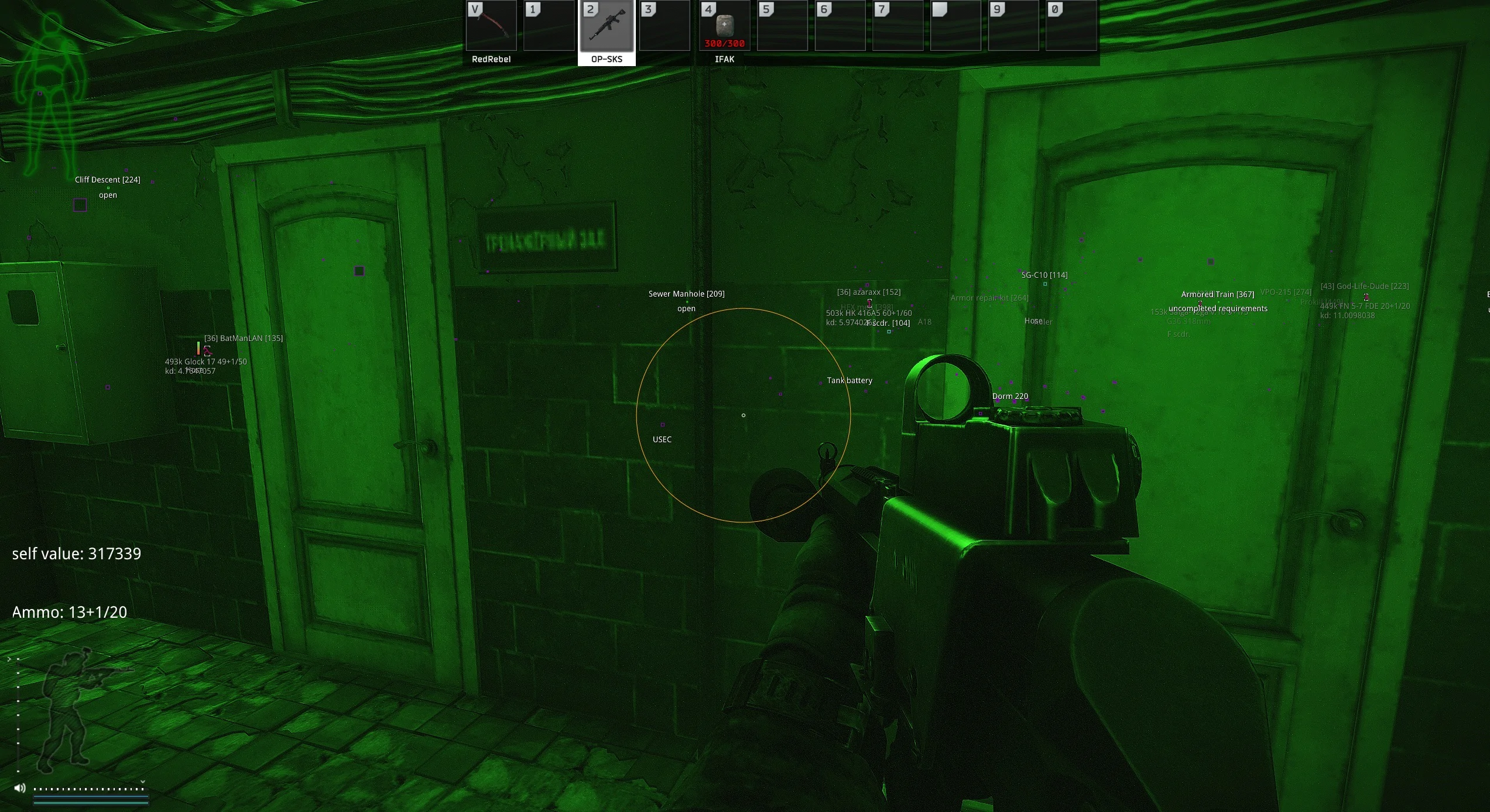 - Видеть все предметы сквозь стены. включая важную информацию. Хорошо настраиваемый! Показать ценности Показать квестовые предметы Показать лут Показать трупы В том числе содержание трупов Показать контейнеры В том числе содержание контейнеров Показать выходы с карты Показать остальное Фильтр предметов по цене Поиск предметов по фильтру (Вы можете указать название предмета и он отобразится на карте, если присутствует в этом рейде)
