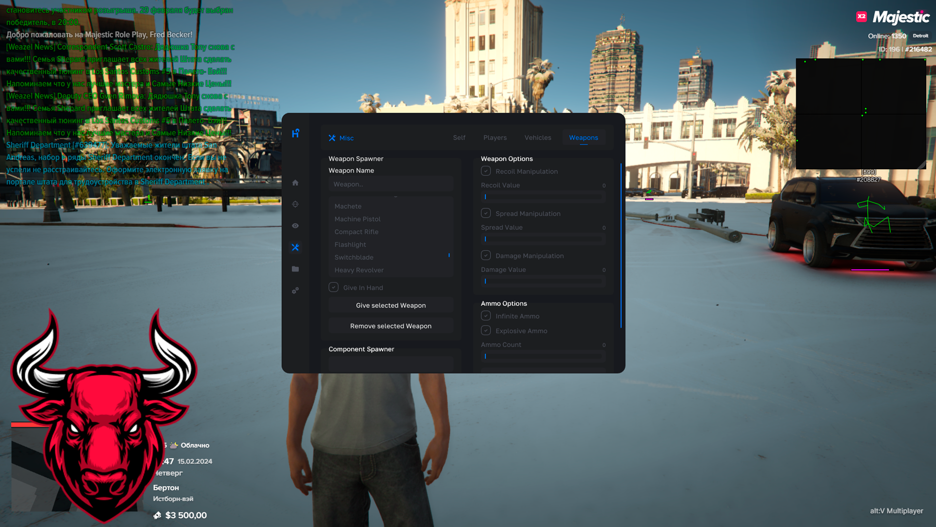 - Misc: Weapon: Give Weapon, Give Weapon attachments, Modify Spread / Recoil, Explosive Bullets and more