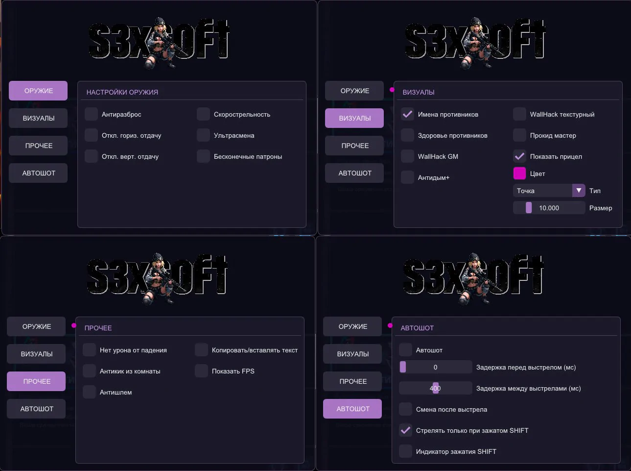 S3x - один из топовых провайдеров приватных читов для различных игр. Данный чит на PointBlank, зарекомендовал себя с лучшей стороны, регулярные обновления, хороший функционал, много положительных отзывов и все это по доступной цене!