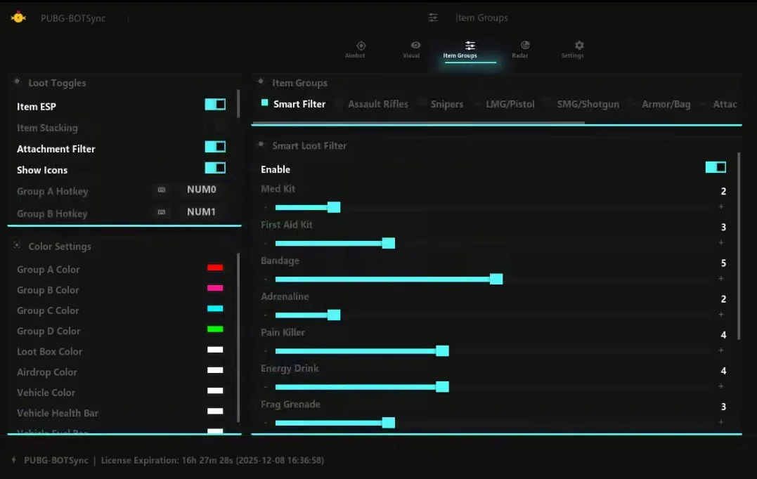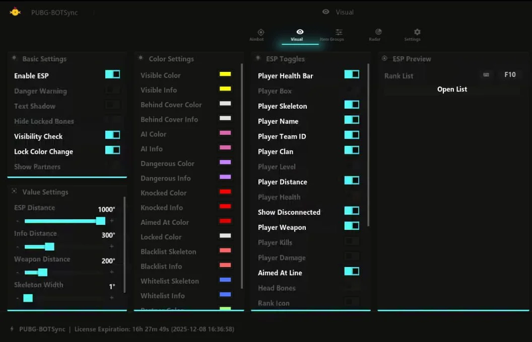 - Настройка ESP и Aimbot для каждого оружия — настраиваемые параметры для AR, DMR, SMG, дробовиков, пистолетов, оружия ближнего боя и метательного оружия.