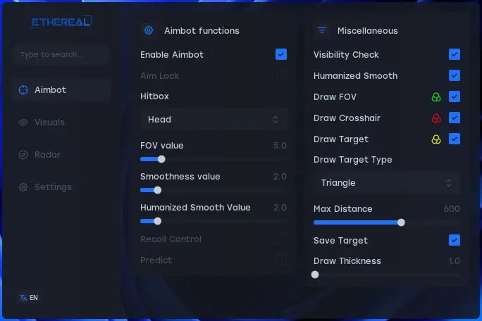 Ethereal - один из топовых провайдеров приватных читов для различных игр. Данный чит на PUBG WH,AIM, зарекомендовал себя с лучшей стороны, регулярные обновления, хороший функционал, много положительных отзывов и все это по доступной цене!