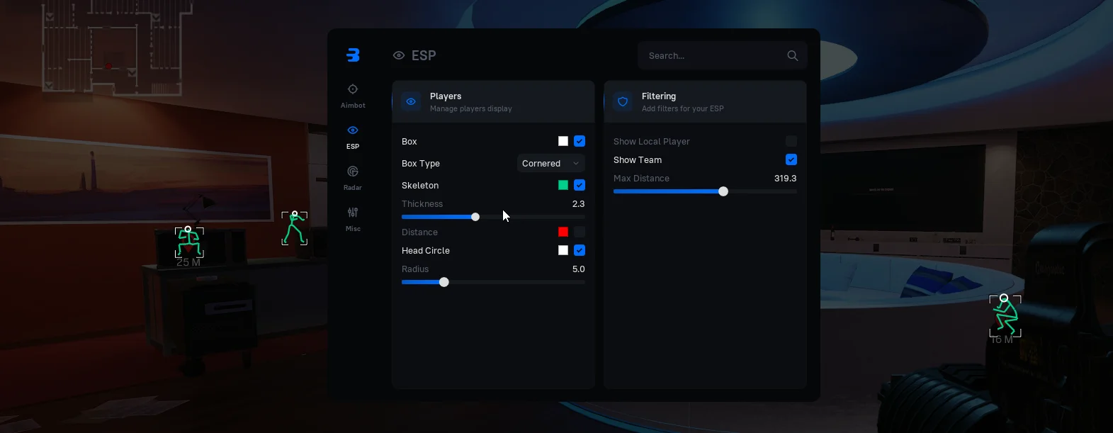 - Поддержка ESP для врагов, союзников, ботов, трупов, транспорта и брошенного оружия — всегда держите ситуацию под контролем.
