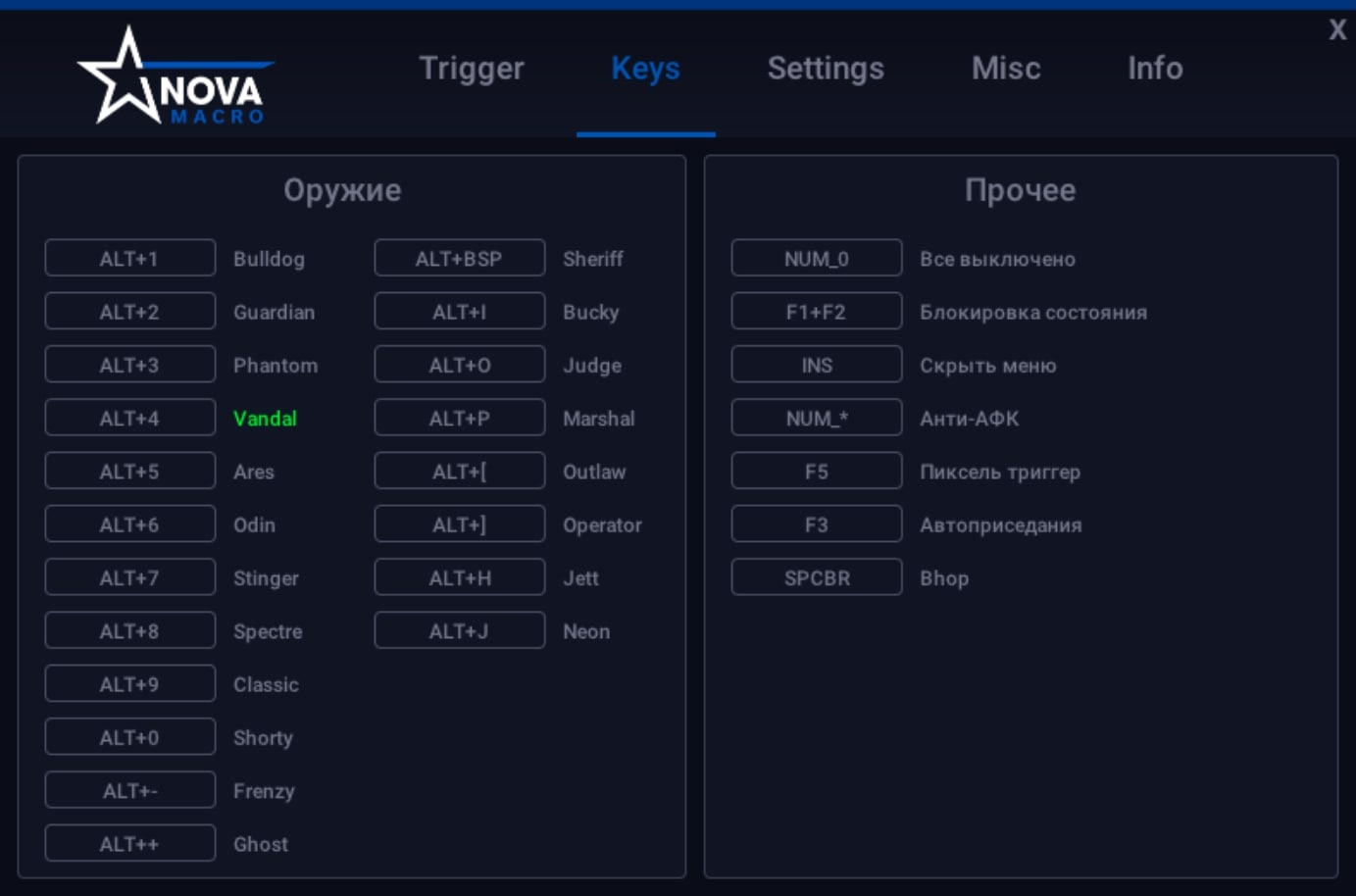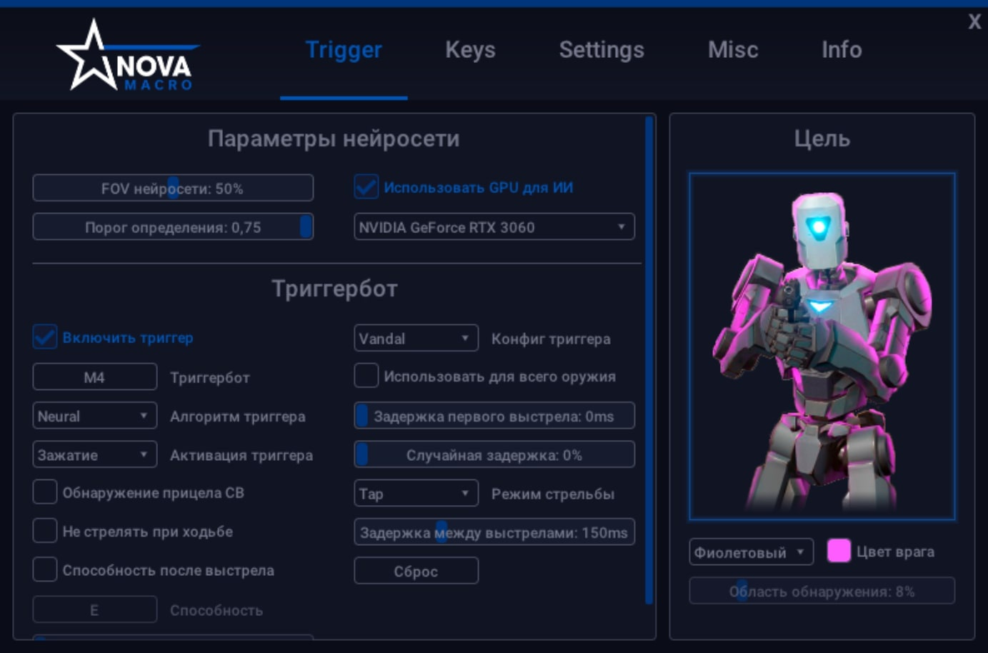 Nova Trigger - один из топовых провайдеров приватных читов для различных игр. Данный чит на Valorant, зарекомендовал себя с лучшей стороны, регулярные обновления, хороший функционал, много положительных отзывов и все это по доступной цене!